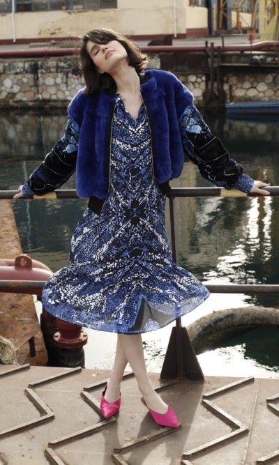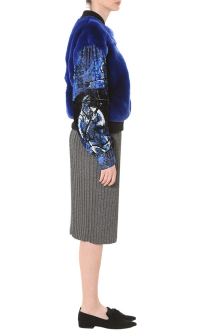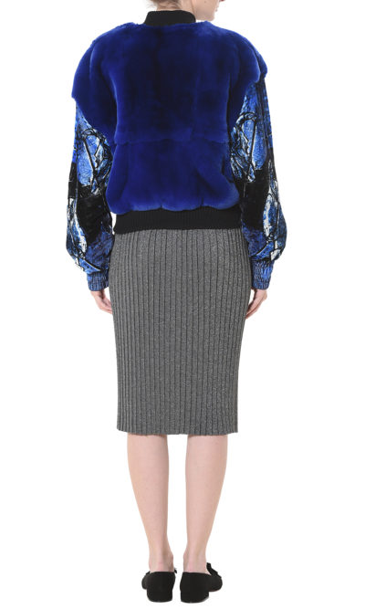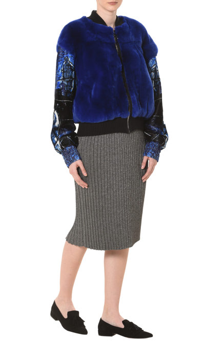 This Blue Morning Bomber jacket is made from sumptuous rex fur in a vivid sky blue color and hits just below the waist. The smooth fur is paneled by the velvet printed sleeves, ended with sporty ribbed stretch-merino wool trims. Slip yours over a tonal black or navy outfit.