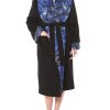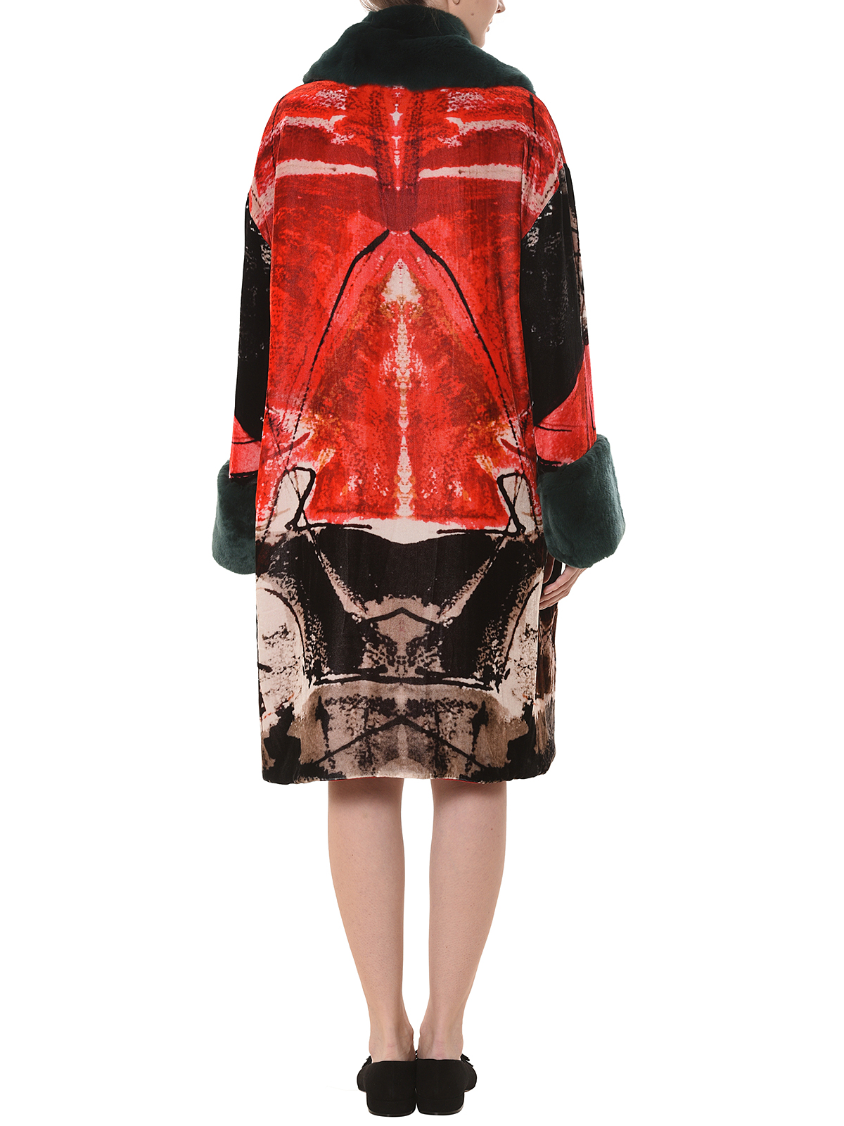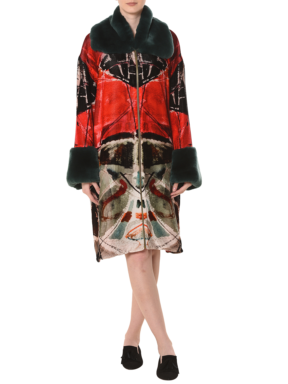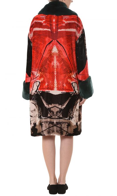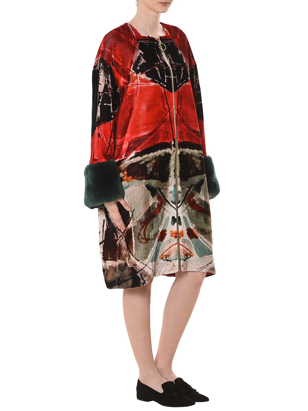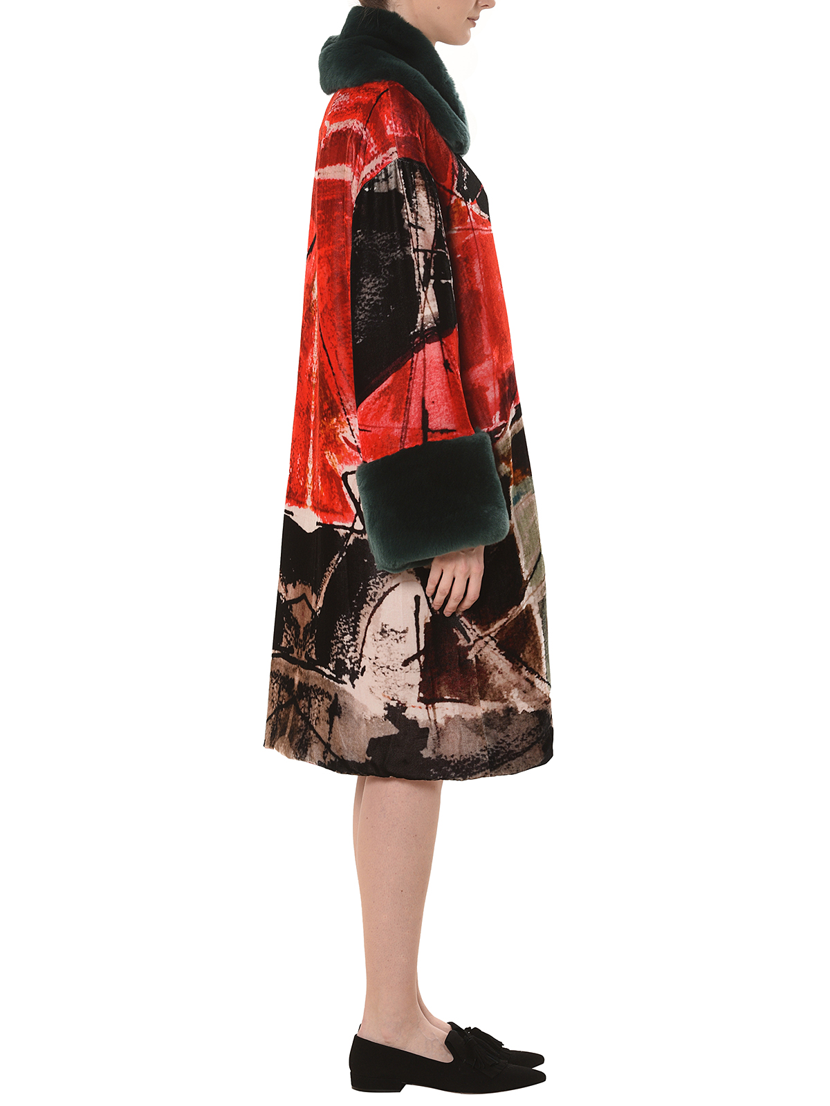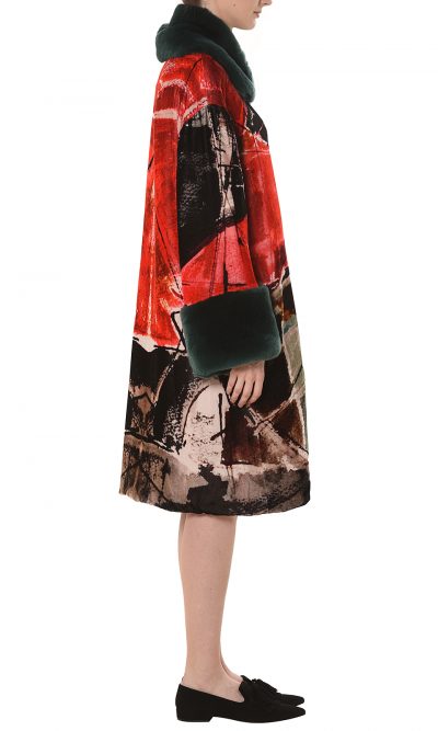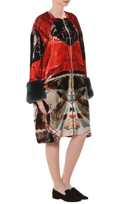 Sophisticated and beautifully draped, this “Red Wave” coat is made from printed velvet with Eva Cerbu watercolor “Ship in the seaport”, that almost makes you fell the movement of the water. It’s designed for a slightly loose silhouette, collarless neckline and a front fastening with an eye-catching chrome zipper. For a soft and lustrous detail the sleeves are hand-finished with natural rex fur in complementary green color.
