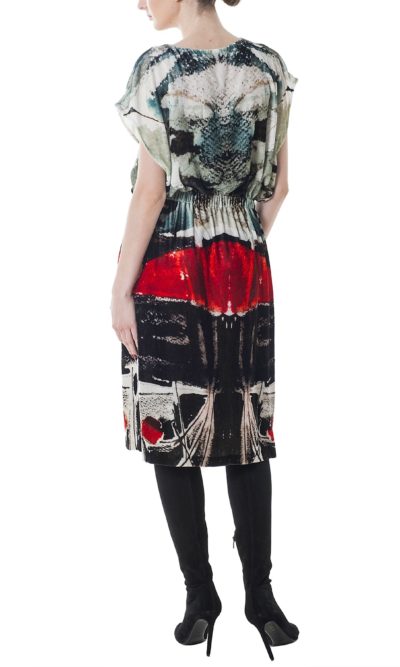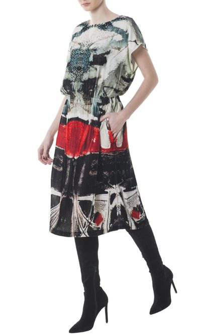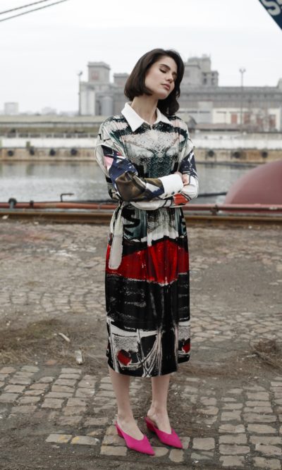 Simplicity is the key element that makes this pieces flattering. Cut from silk velvet, this midi style is printed with artist Eva Cerbu graphic “Ship in the seaport” that holds its shape beautifully with the elasticated waist for a touch of definition. It looks so cool with boots!