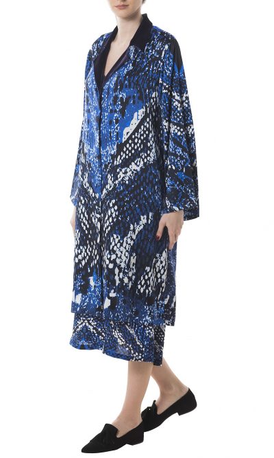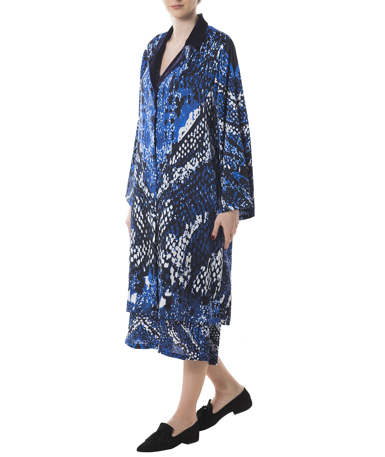 This timeless robe-style is so chic that you can wear it directly on the skin, to feel the soft touch of the silk or layer it over a pair of jeans and a sparkling top from our collection. With it’s fluid design it drapes over the body in the most flattering way and the violet velvet collar gives a truly magnificent look.
