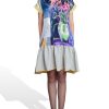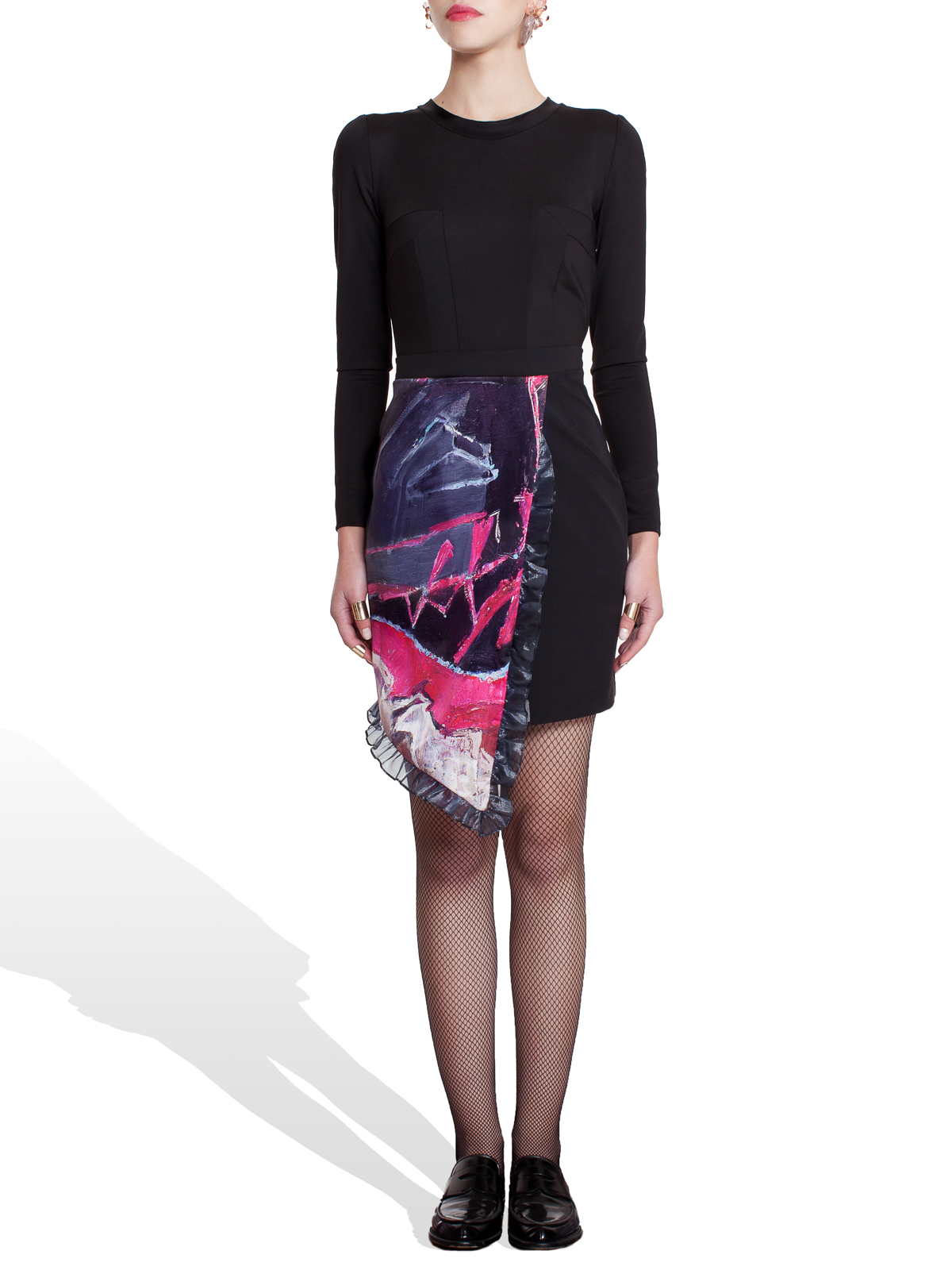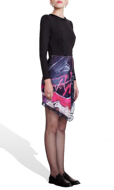 The Frame Stamp Dress is perfectly mold to the body and accentuates curves with black straps elegantly put on the top like a frame. The overlay at the front is made of printed silk, fringed by blu shiny silk. Keep your look minimal with tonal sandals and gold jewelry.