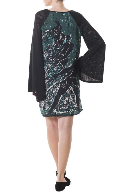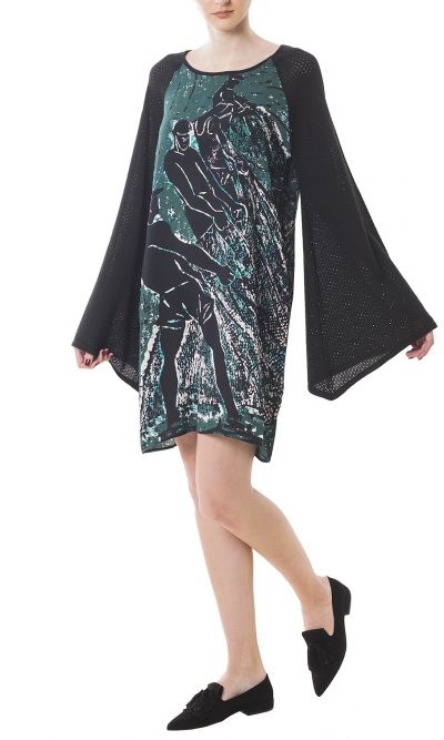 This “Green tide” dress is cut from fluid light silk printed with the green version of “Fishing nets” graphic. It’s perfectly paneled by the oversize flouted sleeves made from a soft blend of wool. Slip it on and wear it with high heels or sneakers.