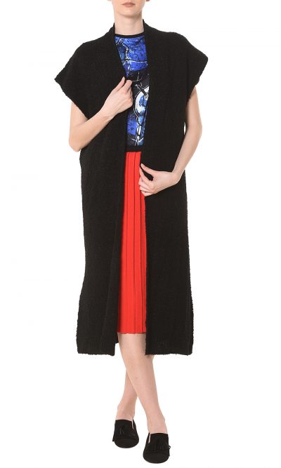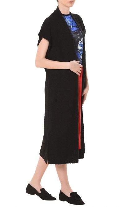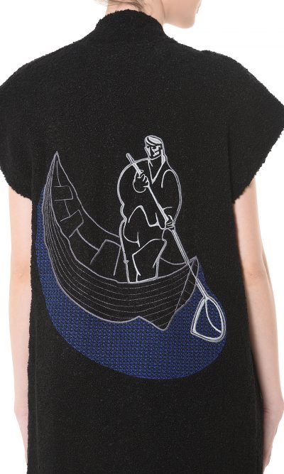 This long vest, on black, is perfect on those days when there’s a chill in the air but you don’t quite need a coat. It’s spun from a wool-blend with a boucle woven touch. The best is the embroidered detail on the back, a Fisherman from “Early Morning” graphic by Eva Cerbu. Leave it undone, and layer it over a T-shirt and pants…