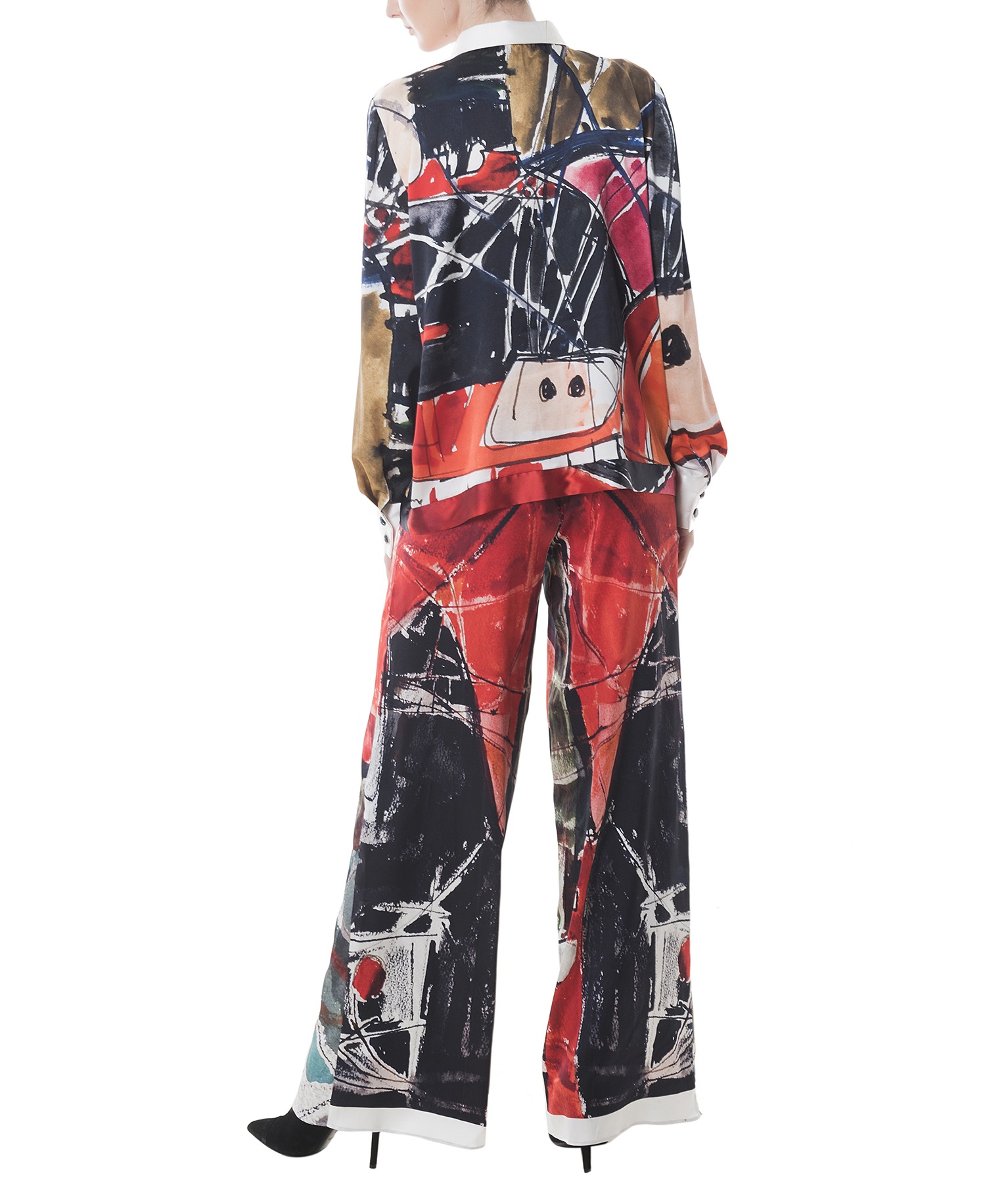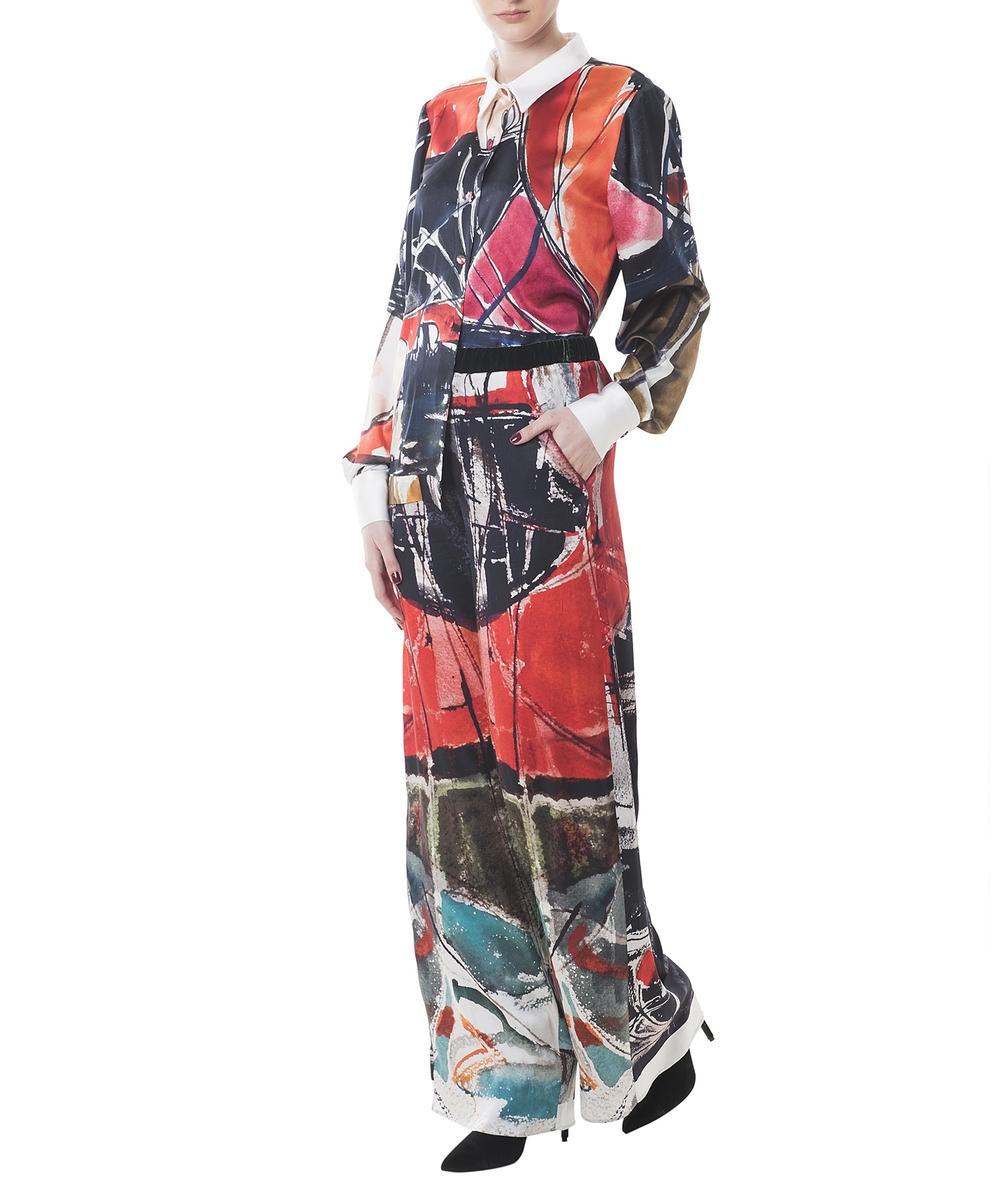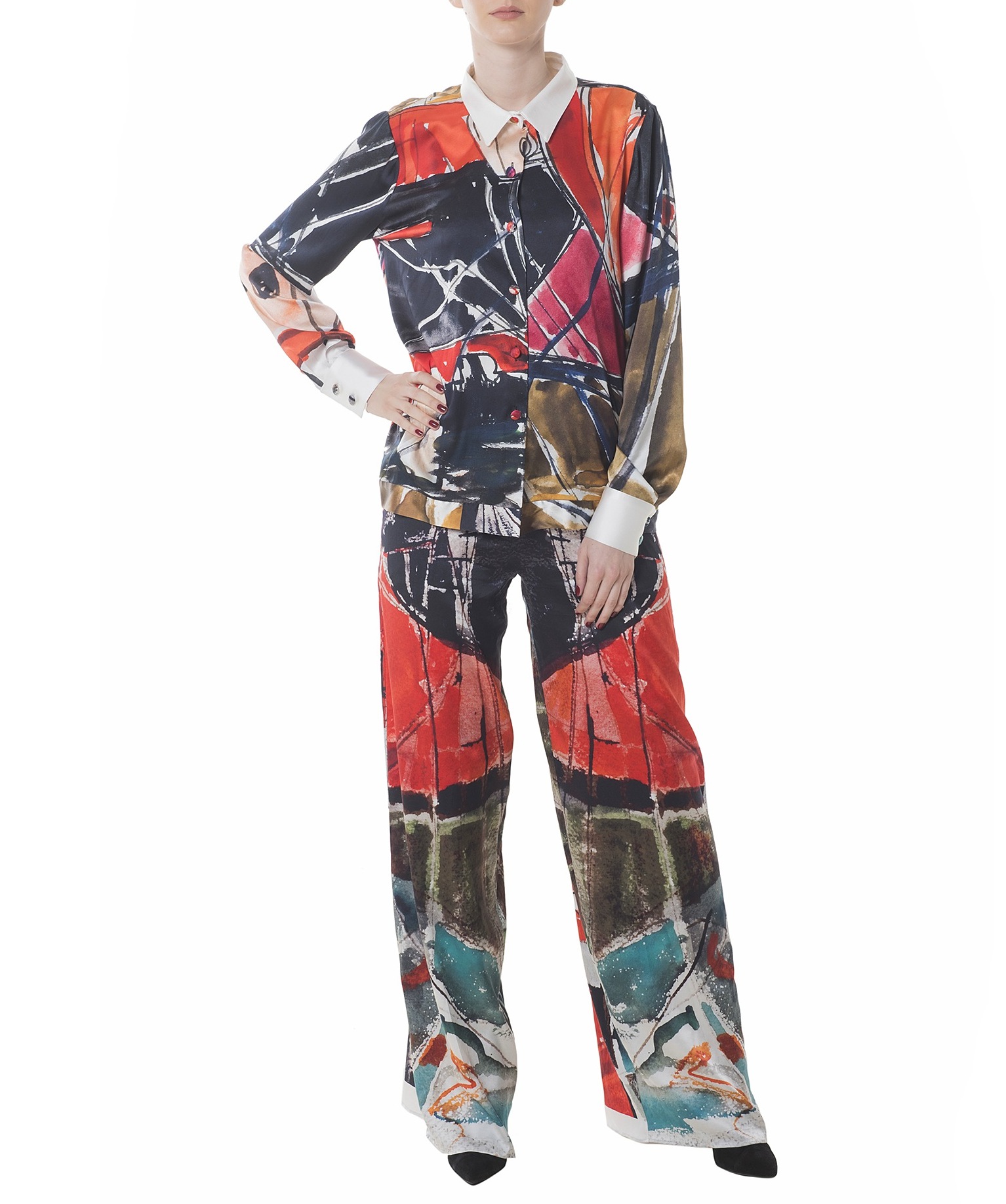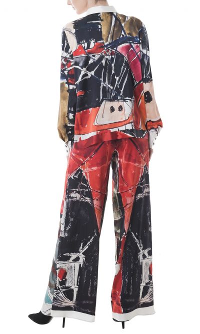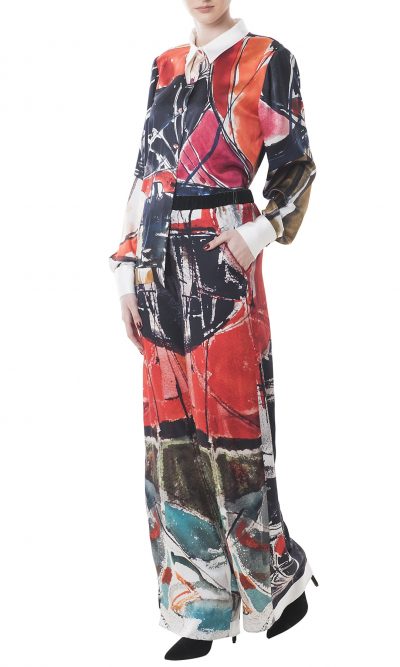 Inspired by Eva Cerbu’s “Ship anchored” water color, this lustrous silk shirt frees the art to be worn. With a classic cut is defined by the sharp collar and wide cuffs, detailed with silk covered buttons that makes it a sophisticated piece. It looks especially chic with large silk pants and pumps.